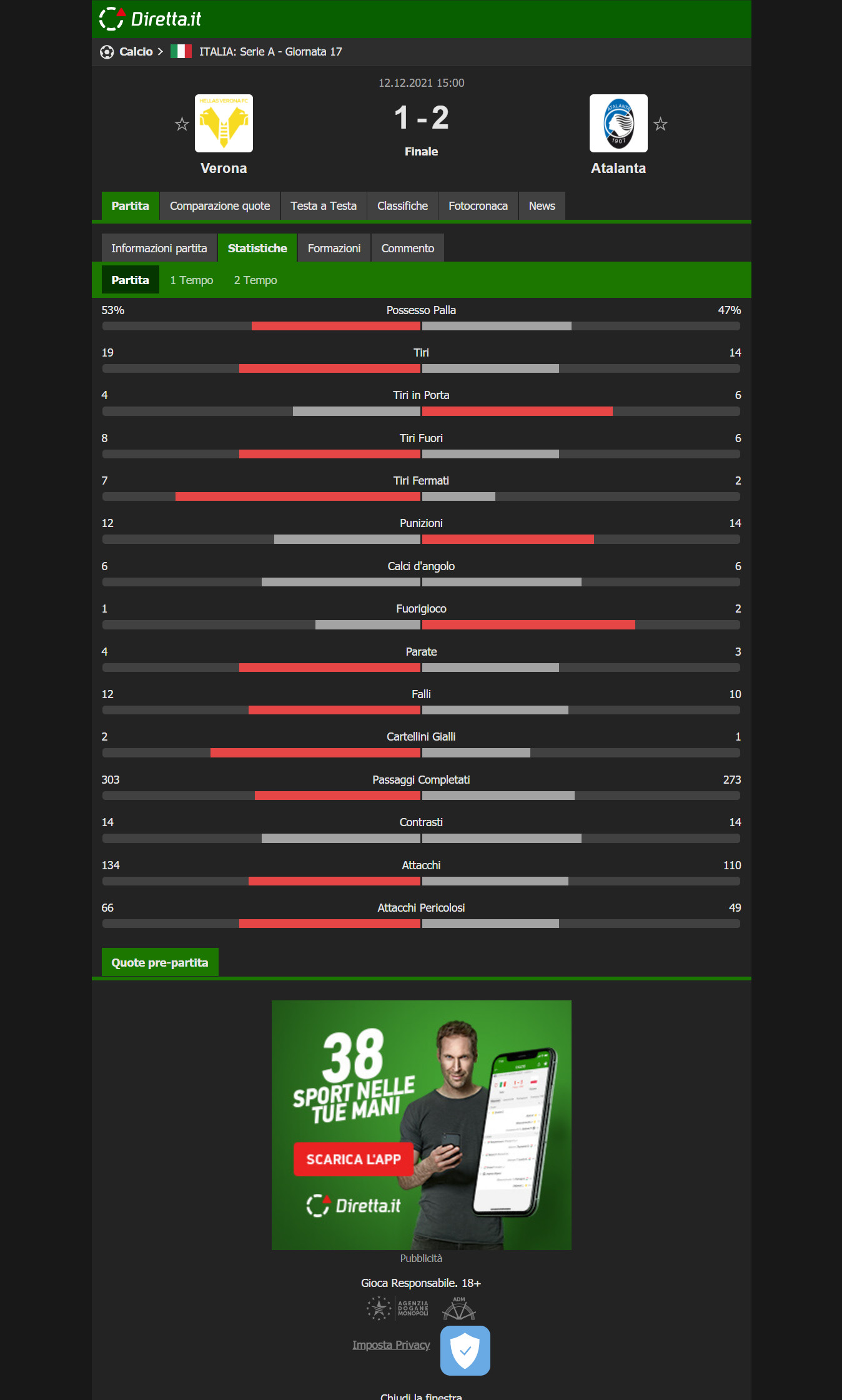 Verona - Atalanta, le statistiche