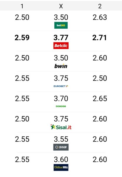 Proviamo a dimenticare il passo falso in campionato concentrandoci sulla prima di champions, terzo anno consecutivo per i nostri, è ancora un sogno! Contro di noi il Villarreal, fresco vincitore dell'Europa League, che bello poter vivere queste sfide, e le quote sono molto simili se non equiparate, sinonimo di sfida aperta, speriamo in bene..