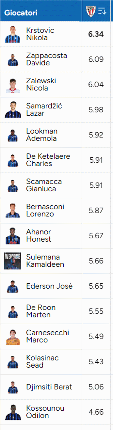 La debacle del secondo tempo ha influito pesantemente sulle pagelle di voi lettori nonostante l'ottimo primo tempo di tutta la squadra. Solo Krstovic, Zappacosta e Zalewski risultano leggermente sopra il 6. Peggiore in campo per la Dea Kossounou cui non avete chiaramente perdonato quel paio di svarioni in difesa sui gol dei baschi.