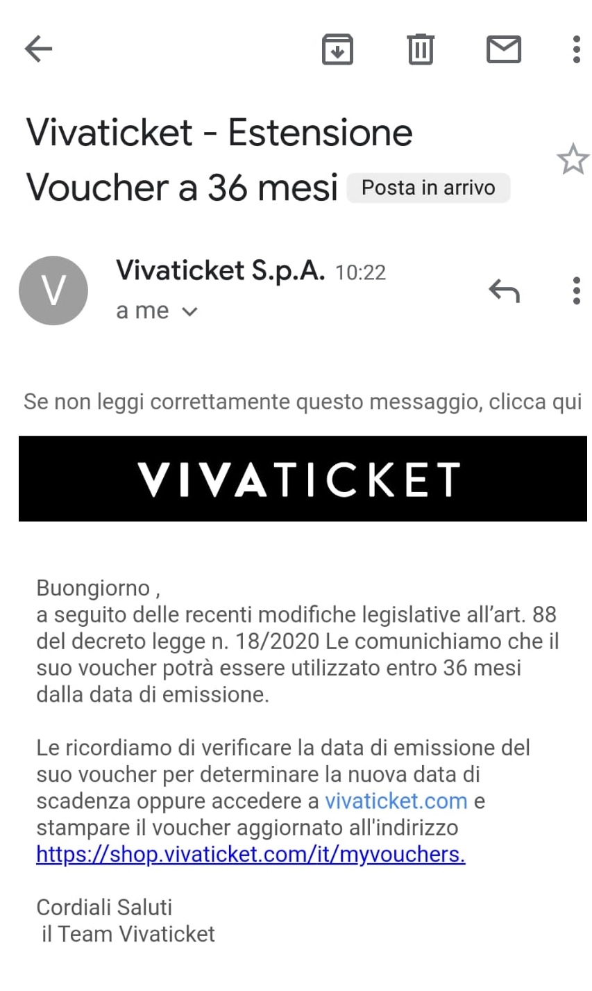 Ai proprietari di voucher sta arrivando una mail in cui Vivaticket comunica che la scadenza del buoo derivante dagli abbonamenti e biglietti è stata estesa a 36 mesi.