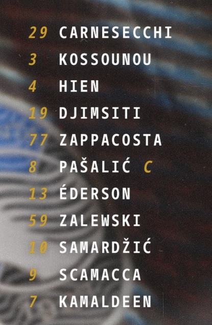 ATALANTA (3-4-2-1): Carnesecchi; Koussounou, Hien, Djimsiti; Zappacosta, Ederson, Pasalic, Zalewski; Samardzic, Sulemana; Scamacca.