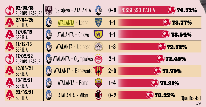Un'interessante tabella dalla Gazza di oggi: con il Lecce settimana scorsa abbiamo sfiorato il record di percentuale di possesso nell'era Gasperini