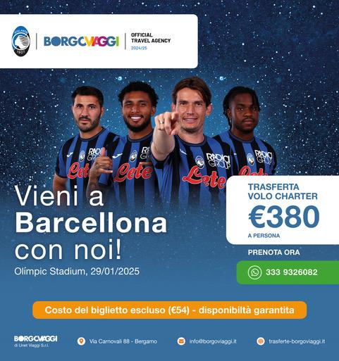 16/01/2025 | 23.30 0 A Barcellona col vettore ufficiale Atalanta, ancora pochi posti! ULTIMI POSTI PER BARCELLONA, ASSICURATI VOLO IN GIORNATA E BIGLIETTO PARTITA CON UN MINIMO ACCONTO DI 100 euro. By staff