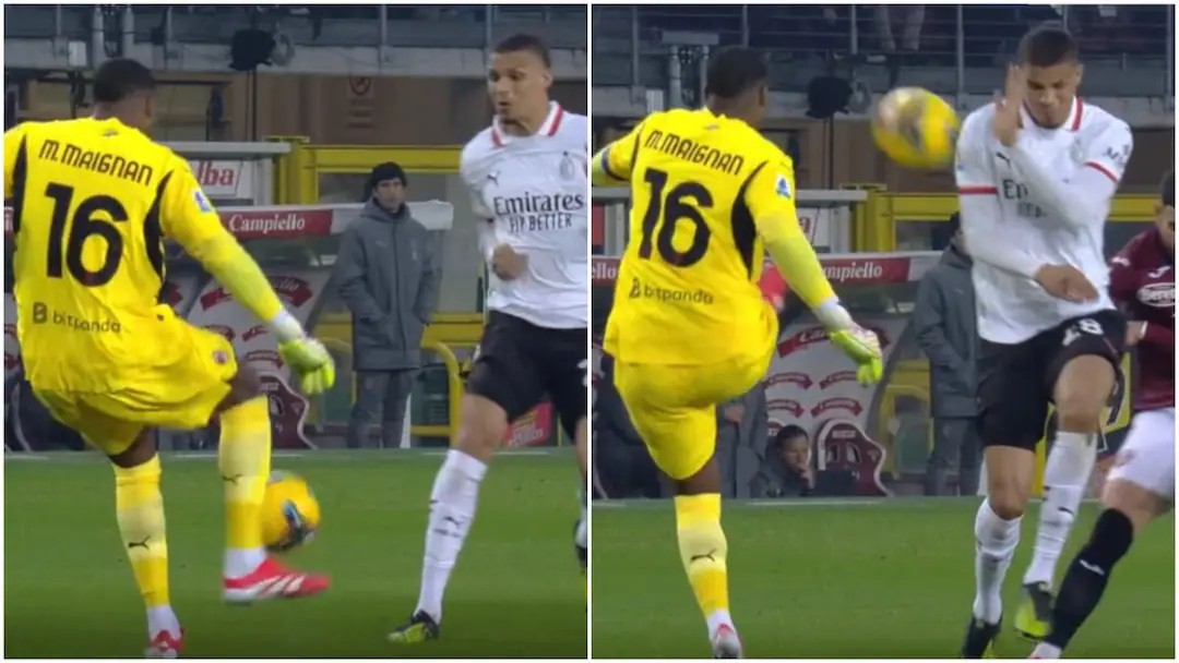 Clamoroso autogol del Milan a Torino: Maignan rinvia e prende in pieno Thiaw davanti a lui.