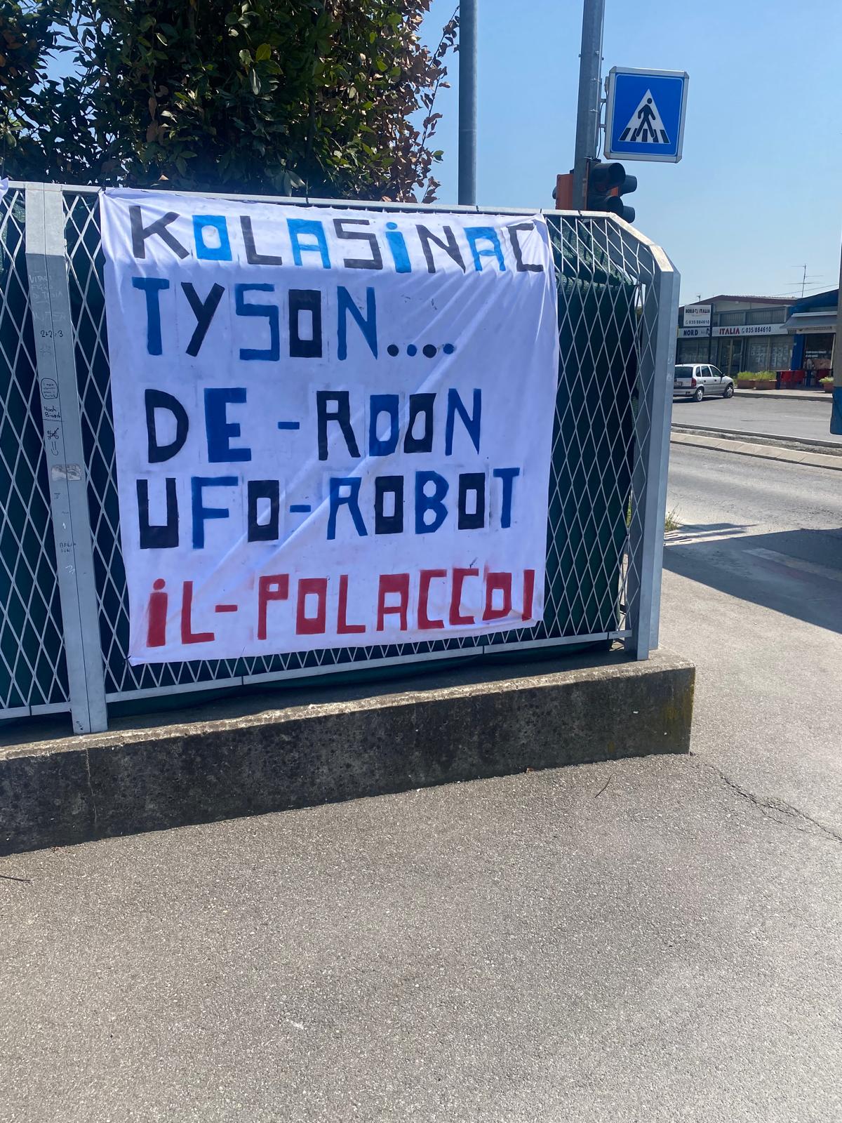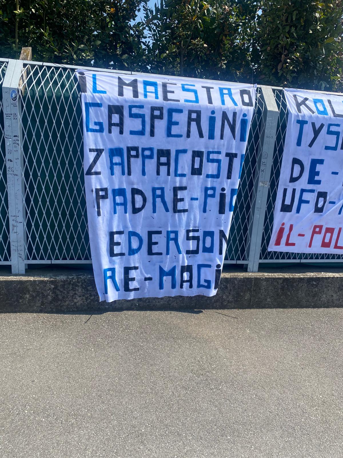 Per ora stanno tutti bene e da domani allenamenti al mattino.Partenza Domenica alle 12.30, per la trasferta più vicina. Allego 2 foto degli striscioni attaccati questa mattino da un simpatico tifoso.Buon 1 Maggio a tutti.😄👋🏼🇪🇪