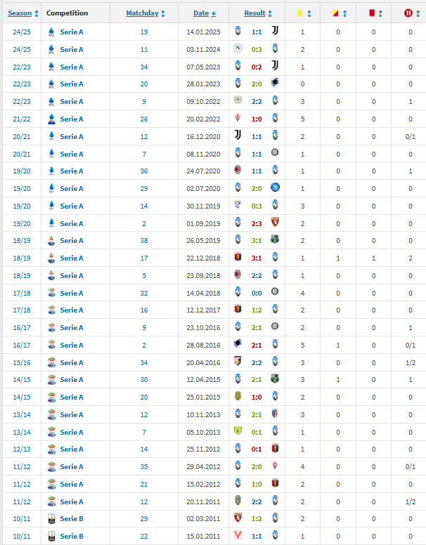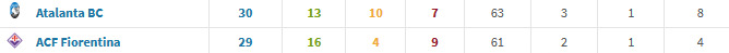 Atalanta 30 partite, 13V, 10N, 7P, 8 rigori Fiorentina 29 partite, 16V, 4N, 9P, 4 rigori
