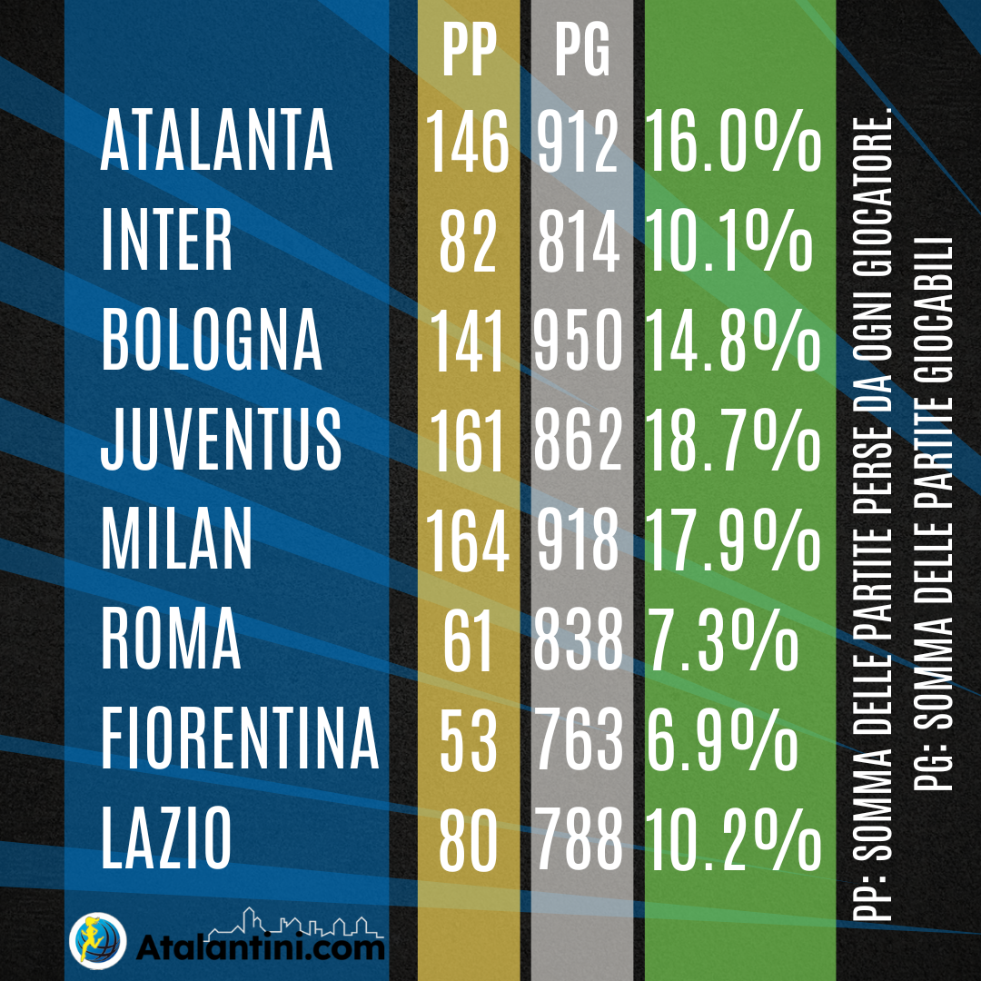 Ecco, gli infortuni, se ne parla tanto ultimamente (non solo tra Atalantini peraltro), ma non avendo competenze mediche non ho nessuna intenzione di discutere le cause degli stessi. Piuttosto, mi chiedevo, ci sono squadre di A più “sfortunate” di altre? E ce ne sono di più “fortunate”?