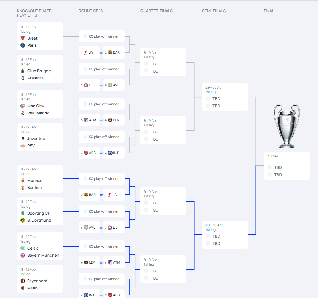 Le squadre vincitrici di questi spareggi accederanno agli ottavi di finale, il cui sorteggio è previsto per il 21 febbraio 2025.