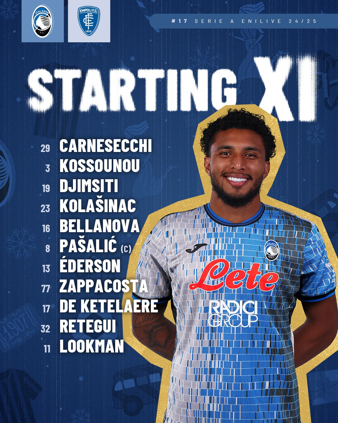 ATALANTA (3-4-3): Carnesecchi; Kossounou, Djimsiti, Kolasinac; Bellanova, Ederson, Pasalic, Zappacosta; De Ketelaere, Retegui, Lookman. Allenatore: Gian Piero Gasperini