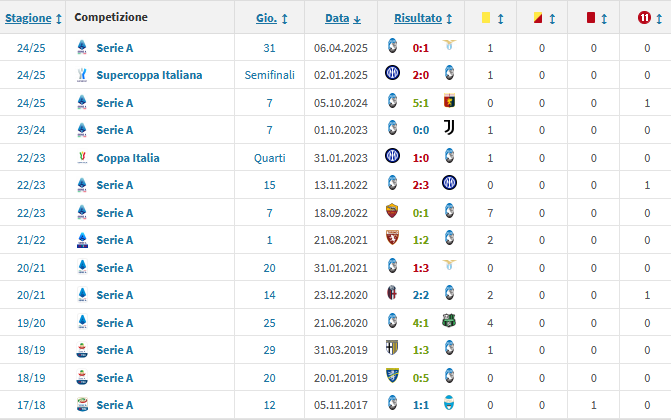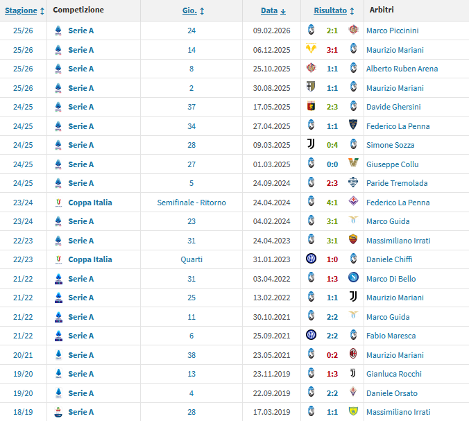 Ventuno le precedenti apparizioni di Aureliano in Sala VAR con l'Atalanta, qui elencate: