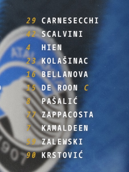 ATALANTA (3-4-2-1): Carnesecchi; Scalvini, Hien, Kolasinac; Bellanova, De Roon, Pasalic, Zappacosta; Sulemana, Zalewski; Krstovic. Allenatore: Palladino