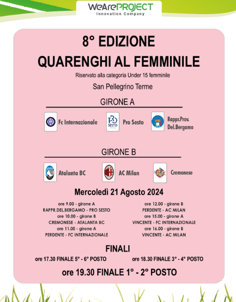 Per quanto riguarda l'Under 15, si parte il 18 agosto con un ritiro a Selvino. Il 21 agosto le ragazze parteciperanno al prestigioso Torneo Quarenghi a San Pellegrino.