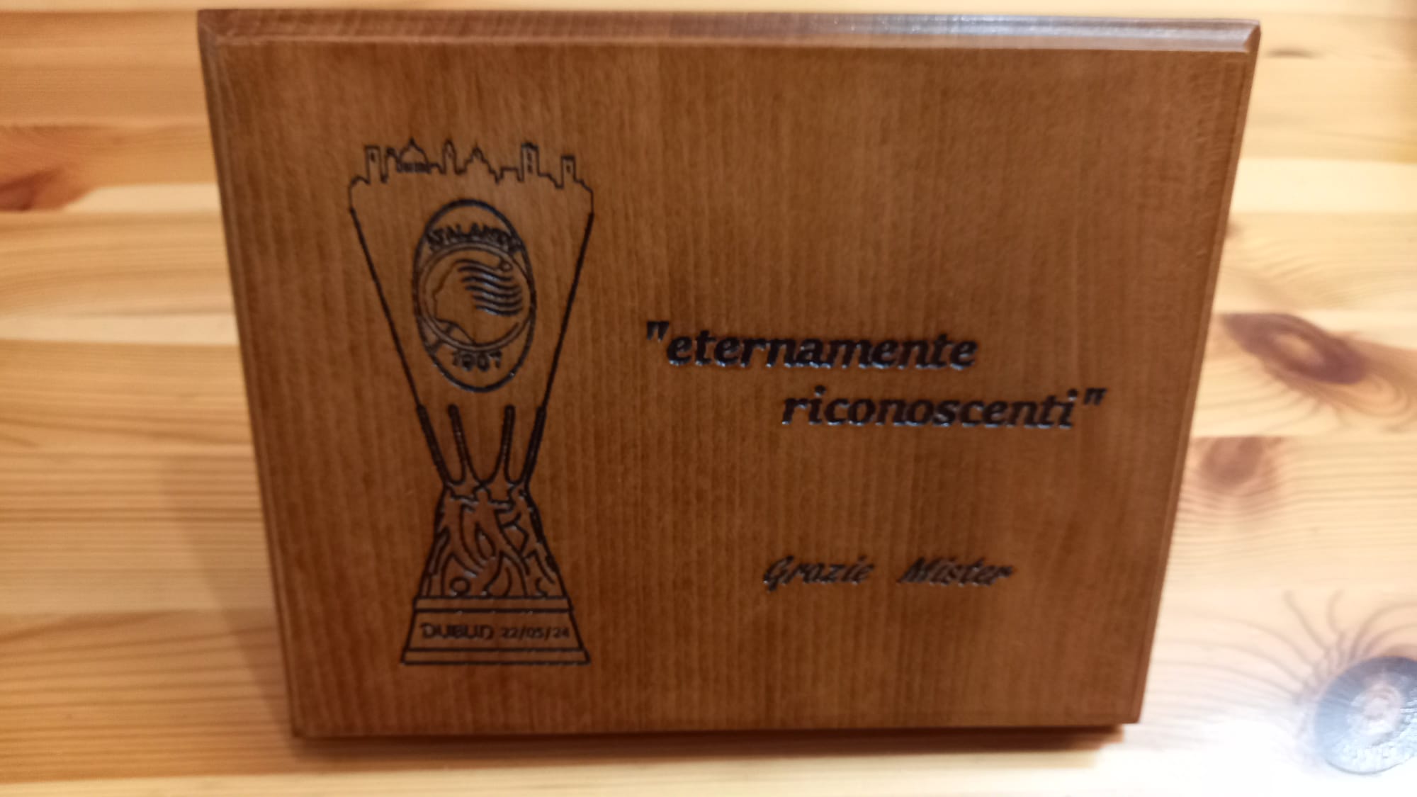 Per l'occasione il gruppo ha regalato al mister un presente con prodotti della nostra terra, Demetrio una riproduzione del logo della Dea in acciaio inox e @colombo_wood (sul nostro sito conosciuto come NAN) una targa in legno, che ha creato come ringraziamento per quello che ha fatto fino ad ora il nostro mister.