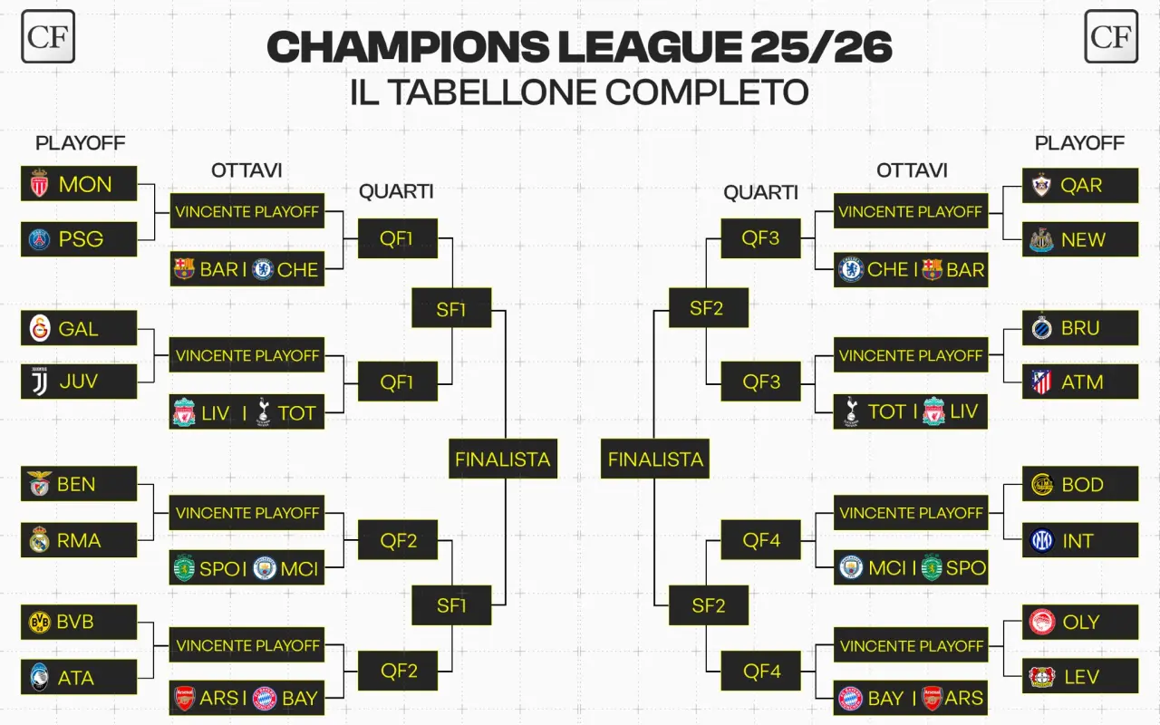 Partendo dall’Inter, i nerazzurri sono stati inseriti nel lato del tabellone in cui non sono presenti italiane. Questo significa che l’unica sfida con Atalanta o Juventus potrebbe materializzarsi solamente in caso di finale. Dal canto loro, Atalanta e Juventus sono state invece posizionate dallo stesso lato. Qualora avanzassero entrambe, si troverebbero in semifinale, con la garanzia – in questo caso – di portare almeno un’italiana all’ultimo atto.