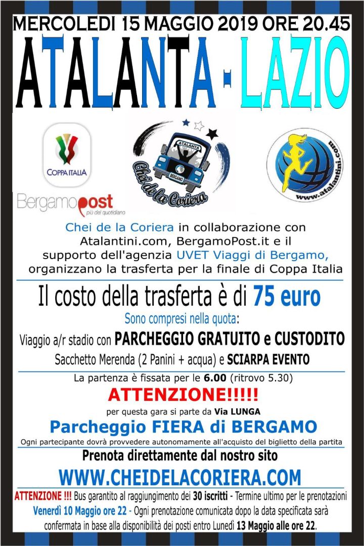 -le prenotazioni per i bus della finale verranno aperte giovedì 2 maggio 2019 alle ore 13 SOLO E UNICAMENTE SU www.cheidelacoriera.com con un massimo di 4 persone prenotabili per ognuno;