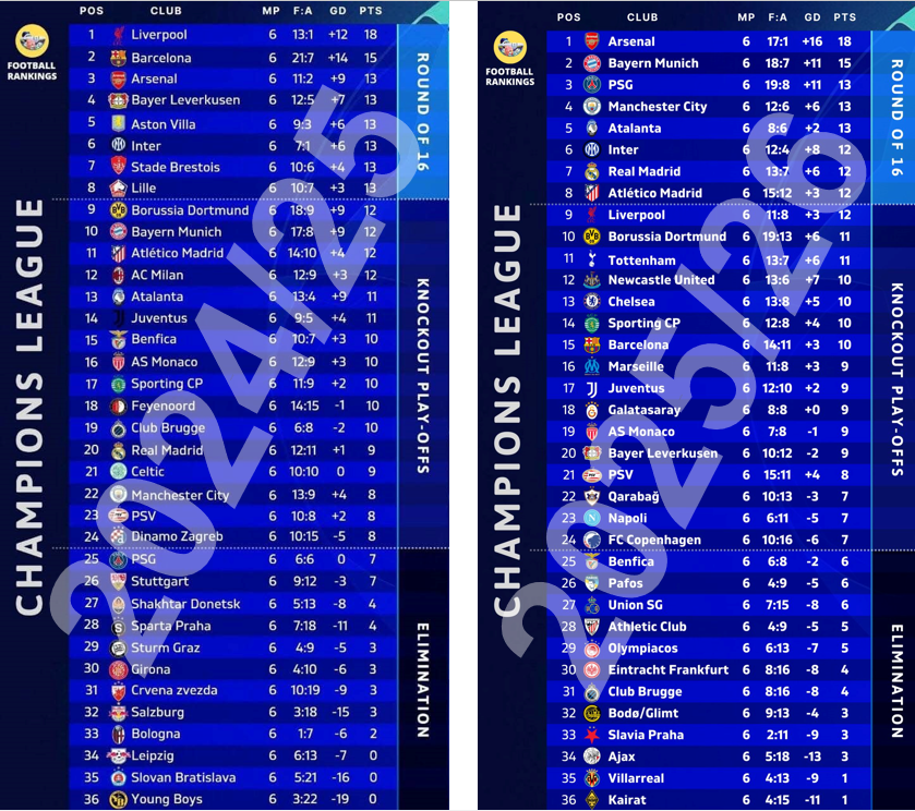Ecco le classifiche di champions dopo 6 giornate (a sinistra la scorsa stagione, a destra quella corrente)