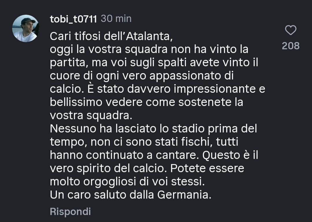 Sui social, da ieri sera, si stanno inseguendo centinaia di post stranieri, soprattutto tedeschi, che spiegano bene l'ammirazione e la stima guadagnati dal popolo atalantino ieri sera. Qualcuno arriva a scusarsi per aver, la sua squadra, infierito così tanto contro di noi.