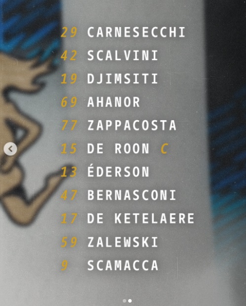 Atalanta: Carnesecchi, Scalvini, Djimsiti, Ahanor, Zappacosta, de Roon, Éderson, Bernasconi, De Ketelaere, Zalewski, Scamacca. A disposizione: Rossi, Sportiello, Kossounou, Hien, Musah, Kamaldeen, Pašalić, Samardžić, Bellanova, Raspadori, Kolašinac, Krstović. Allenatore: Raffaele Palladino.
