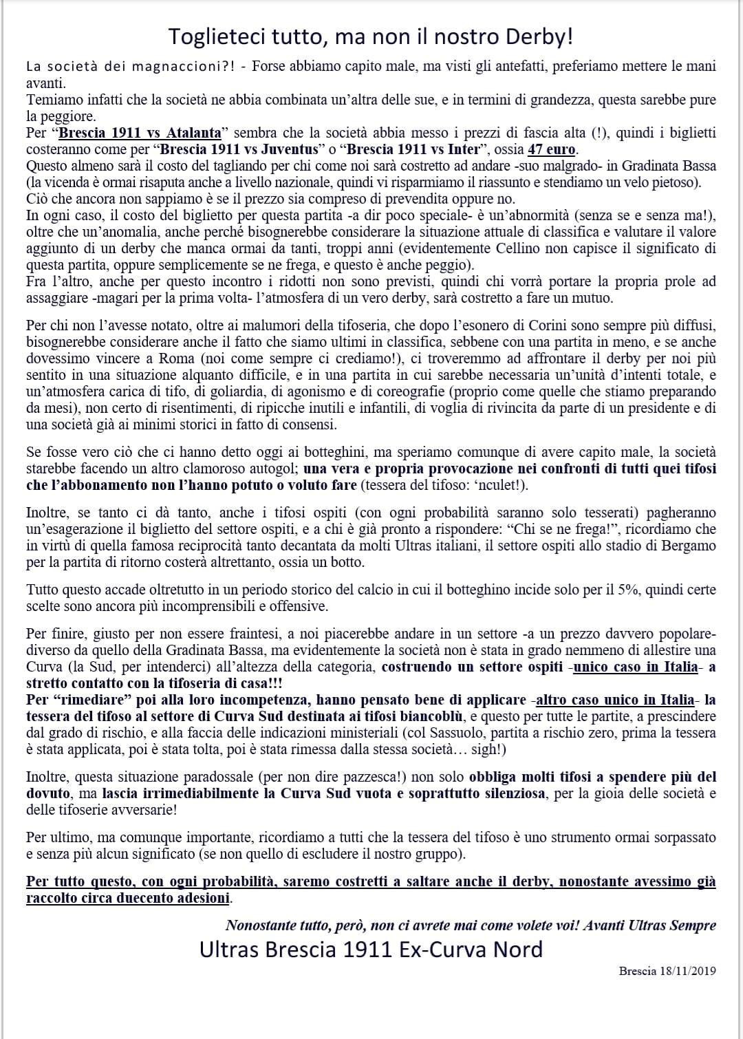 Comunicato degli Ultras Brescia su Brescia - Atalanta