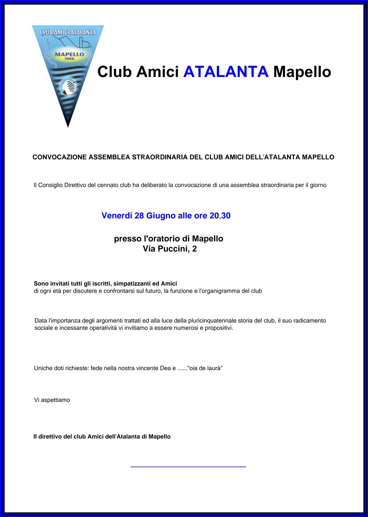 Convocazione Assemblea del 28 giugno 2024 del Club Amici dell'Atalanta di Mapello (BG).