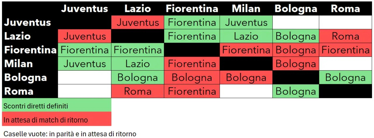 Questa dunque la situazione attuale, in attesa che il quadro si completi nei prossimi mesi. Di seguito, una tabella riepilogativa: per ogni incrocio viene indicata la squadra in vantaggio negli scontri diretti.