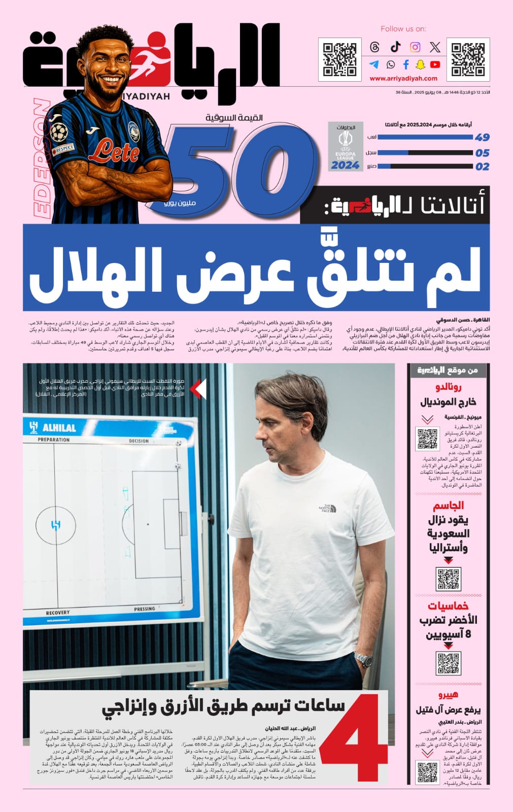 Tony D’Amico, direttore sportivo dell’Atalanta, ha confermato al quotidiano saudita Ariyadhiah (uno dei più autorevoli del regno) che non ci sono state trattative ufficiali da parte della dirigenza dell’Al Hilal per l’acquisto di Éderson durante l’attuale finestra di mercato straordinaria, in vista della partecipazione del club alla Coppa del Mondo per Club.