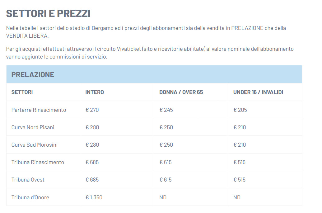 tabelle i settori dello stadio di Bergamo ed i prezzi degli abbonamenti