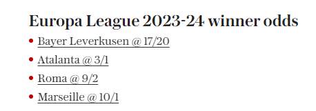 La Roma è quotata 9/2 per arrivare fino in fondo, mentre il Marsiglia, che affronterà l'Atalanta in semifinale, è relativamente lontano con un 10/1.