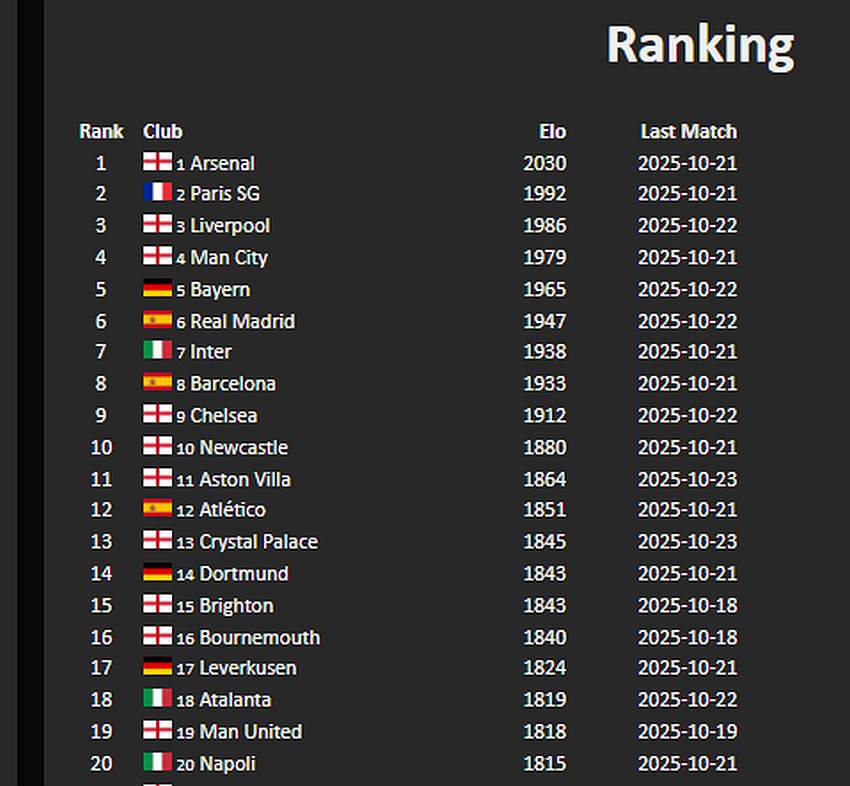 Gli ultimi pareggi senza gol non hanno inficiato piu' di tanto la nostra classifica nel ranking ELO europeo (non ufficiale ma piu' realistico di quello UEFA). Restiamo buoni diciottesimi. Due nobili i nostri compagni di viaggio piu' prossimi : Il Leverkusen 17mo e il Manchester United 19mo