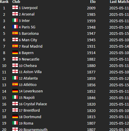 Da segnalare la Juve 21ma superata dal piccolo Bournemouth inglese. Un altro schiaffettino a chi non voleva le squadrette in Champions....