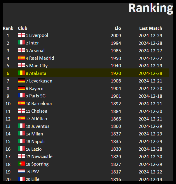 Il nostro pareggio all'Olimpico comunque con una squadra ottimamente piazzata in campionato e in questa classifica come la Lazio e il contemporaneo ritorno alla vittoria del Manchester City (2-0 a Leicester) ci ha allontanato dagli inglesi che stavamo seriamente avvicinando nelle ultime due settimane. Comunque si parla di un distanziamento minimo che ci lascia incredibilmente ancora sopra le due migliori squadre tedesche: il Bayern Monaco e i nostri amiconi del Bayer Leverkusen.