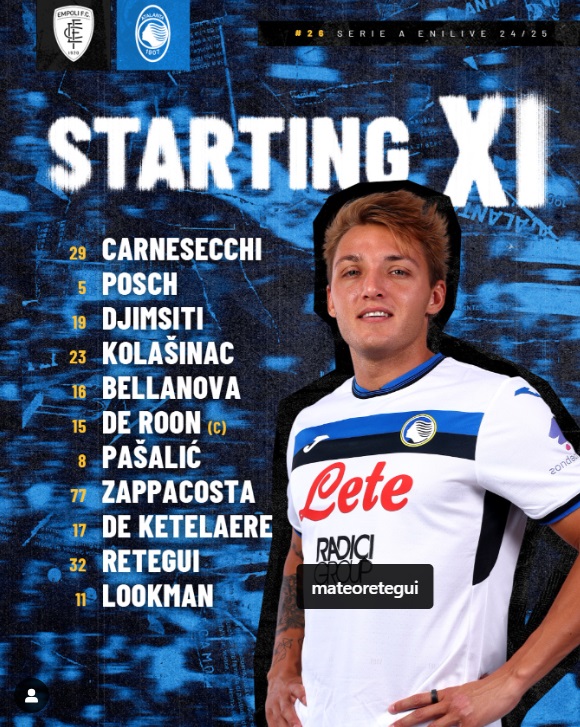 ATALANTA (3-4-2-1): Carnesecchi; Posch, Djimsiti, Kolasinac; Bellanova, Pasalic, De Roon, Zappacosta; Lookman, De Ketelaere; Retegui. All. Gasperini.