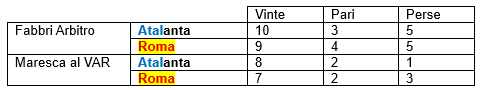 30/12/2025 | 13.54 4 Fabbri arbitra Atalanta - Roma, VAR Maresca (aggiornato con precedenti) ATALANTA-ROMA Sabato 3 gennaio h. 20.45 FABBRICECCONI – BERCIGLIIV: ZUFFERLIVAR: MARESCAAVAR: DI PAOLOIl bilancio della squadra arbitrale con le due squadre è il seguente: Questi i precedenti di Fabbri con l'AtalantaQuesti quelli di Maresca al VAR By marcodalmen