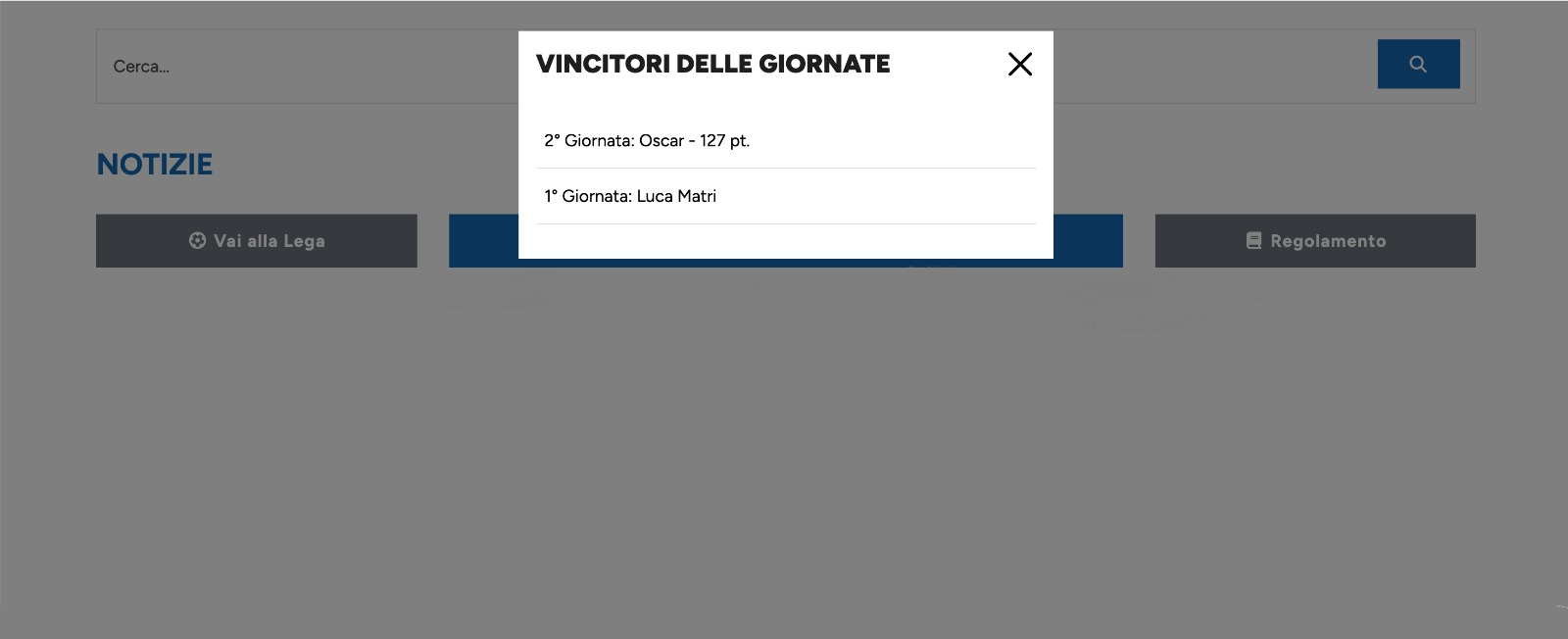 All'interno della sezione troverete, come da esempio qui sotto, un link diretto al sito leghe fantacalcio (per chi non userà la App), un bottone per le classifiche di giornata con i vincitori e il loro punteggio, un bottone per dissipare eventuali dubbi sul regolamento che sarà sempre a disposizione di tutti.