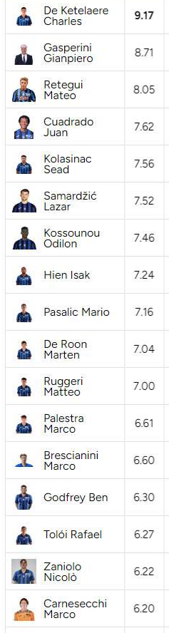 Alle sue spalle,diversi voti molto alti, come vedete qui sotto, testimonianza di una grandissima partita da parte della Dea