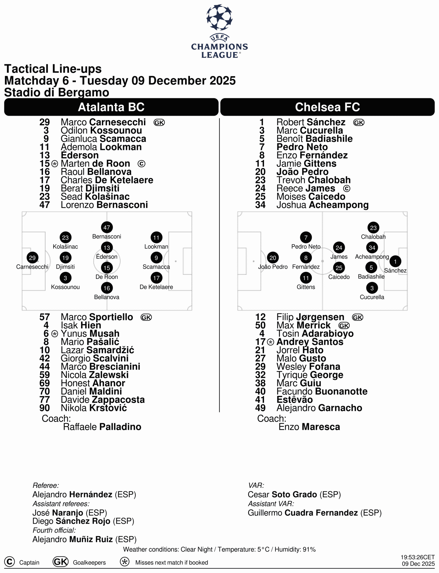 FORMAZIONI UFFICIALI DI ATALANTA - CHELSEA: BERNASCONI TITOLARE