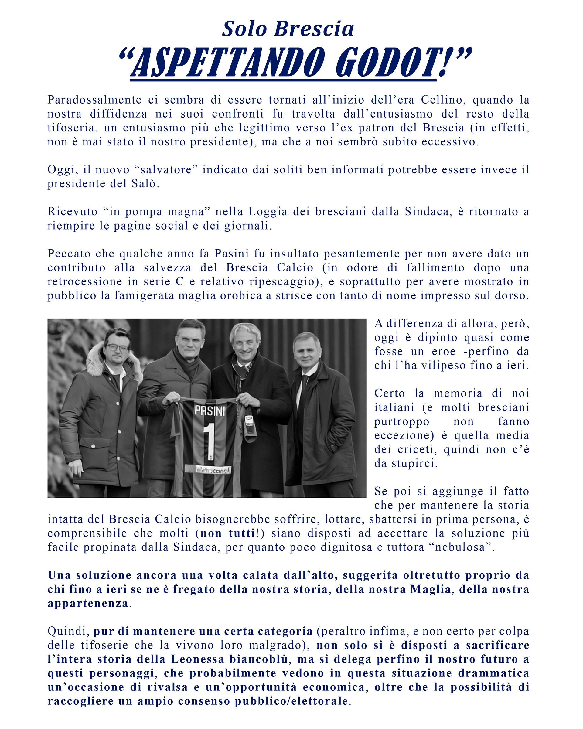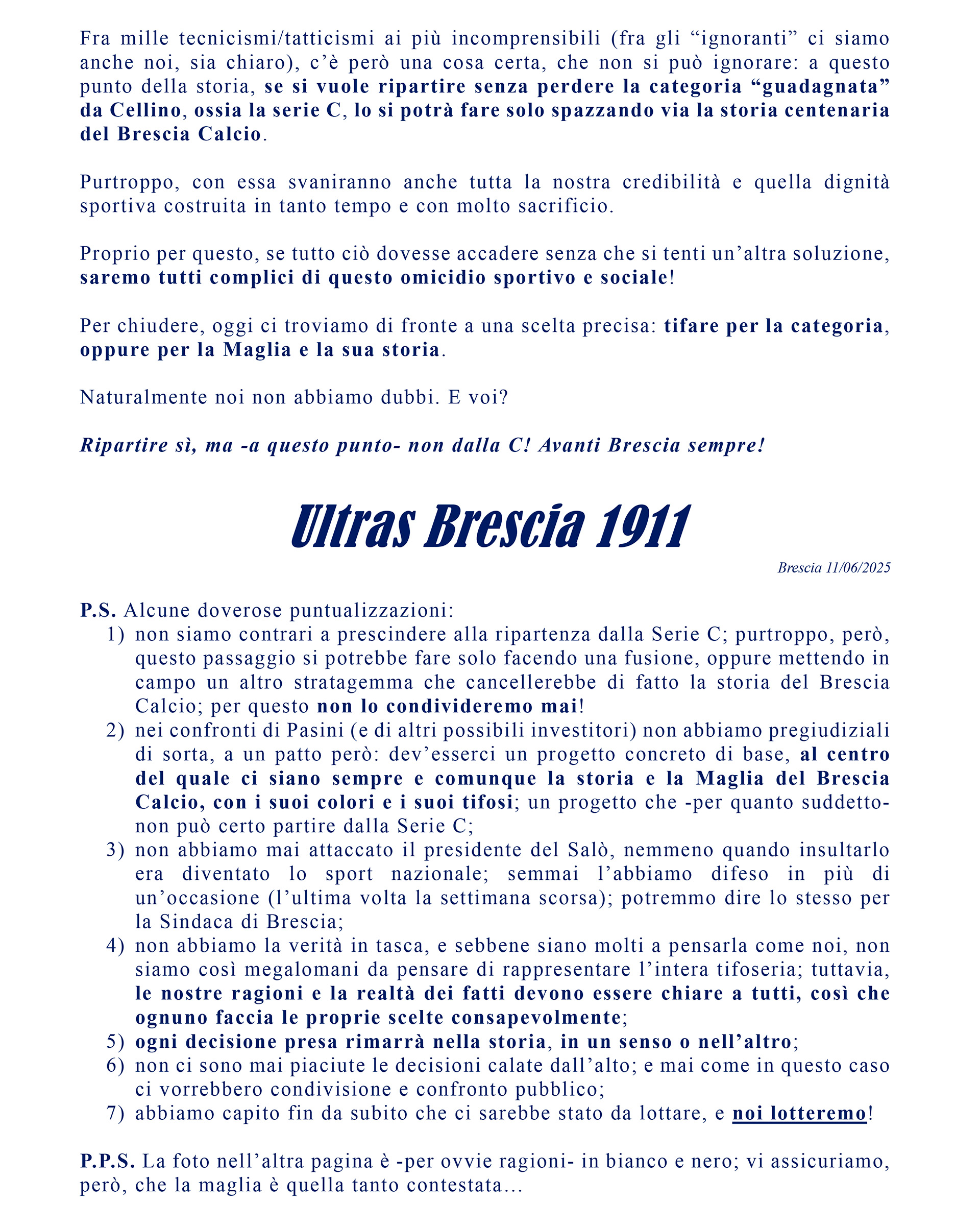 Comunicato ultras BS a seguito dell interessamento del presidente del Salo' per salvare il Brescia calcio