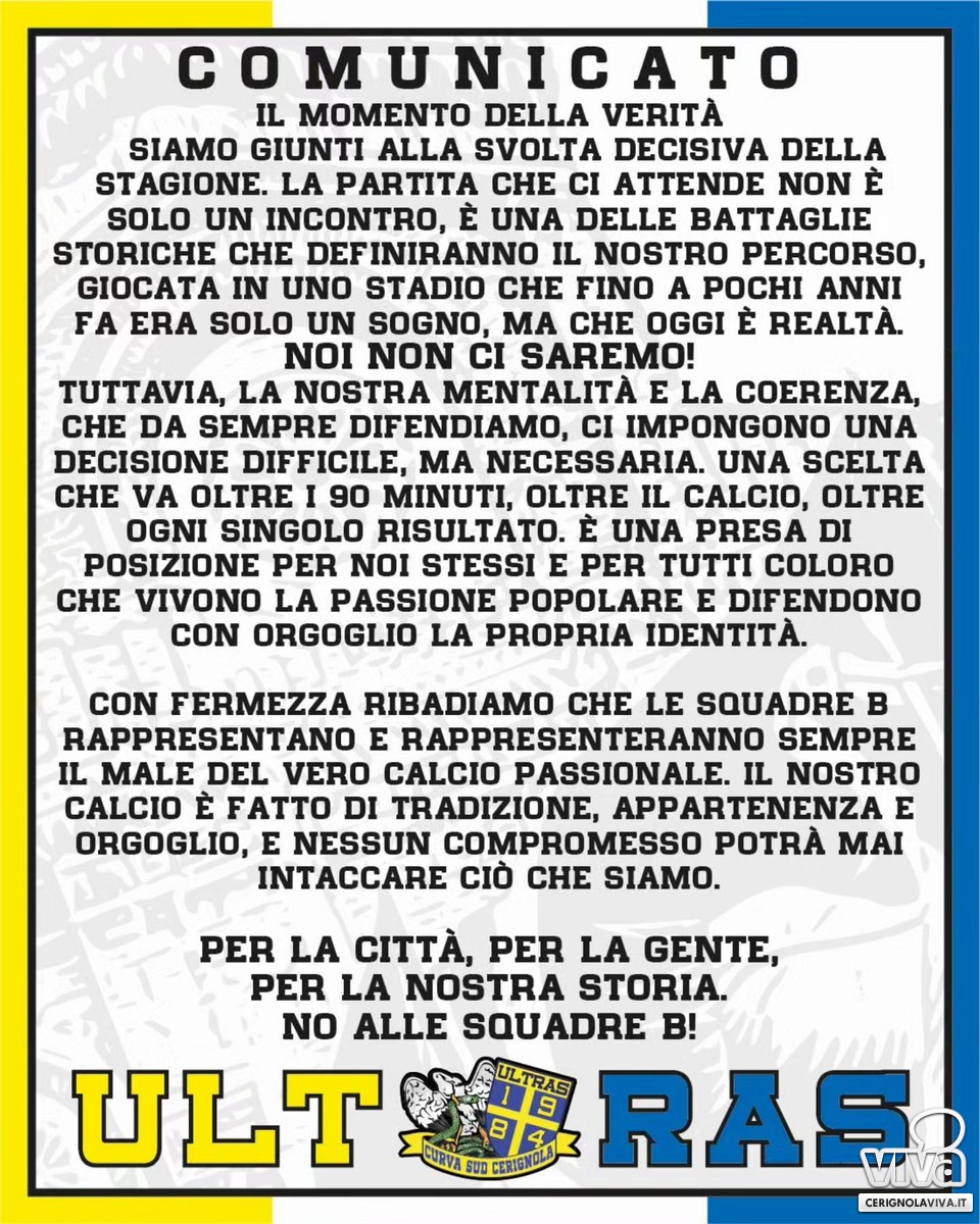Come comunicato dagli stessi Ultras 1984, la tifoseria organizzata gialloblu ha deciso di boicottare la trasferta in protesta contro le "squadre B".