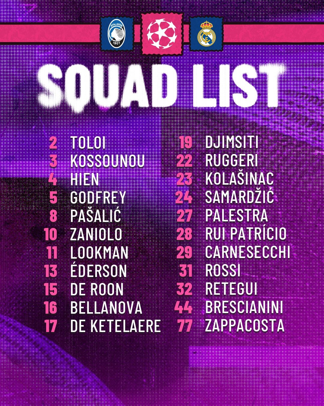 I convocati per Atalanta - Real M., confermata assenza di Scalvini, c'e' Zappacosta
