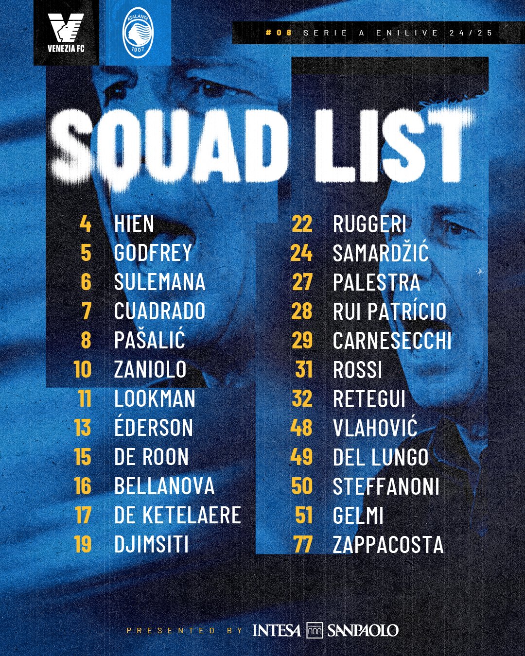 Sono 24 i calciatori convocati da mister Gian Piero Gasperini per Venezia-Atalanta, partita della 8ª giornata della Serie A Enilive 2024/25 in programma domenica 20 ottoobre alle ore 15 allo stadio Pier Luigi Penzo di Venezia: