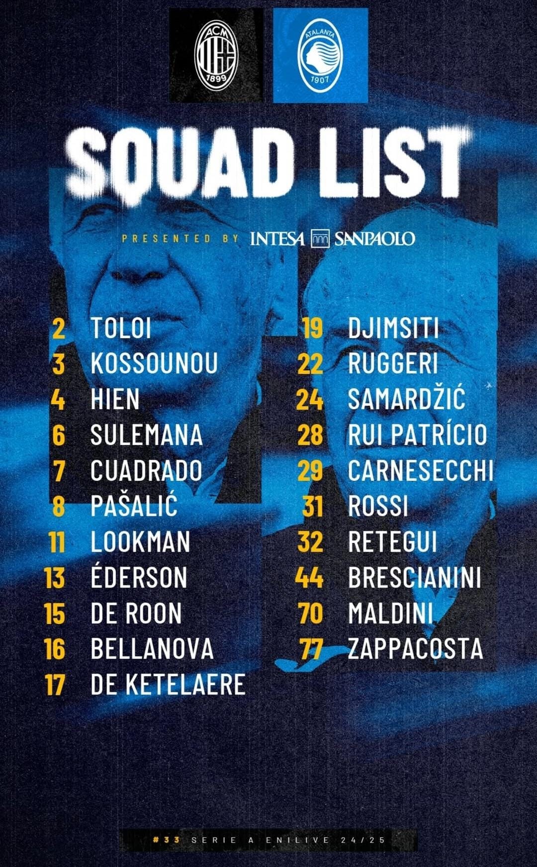 Sono 21 i calciatori convocati da mister Gian Piero Gasperini per Milan-Atalanta, gara della 33ª giornata della Serie A Enilive 2024/25 in programma domenica 20 aprile alle ore 20.45 allo stadio Meazza di Milano: