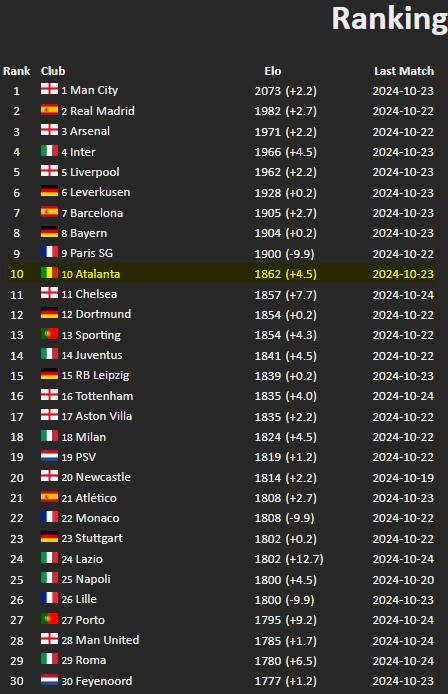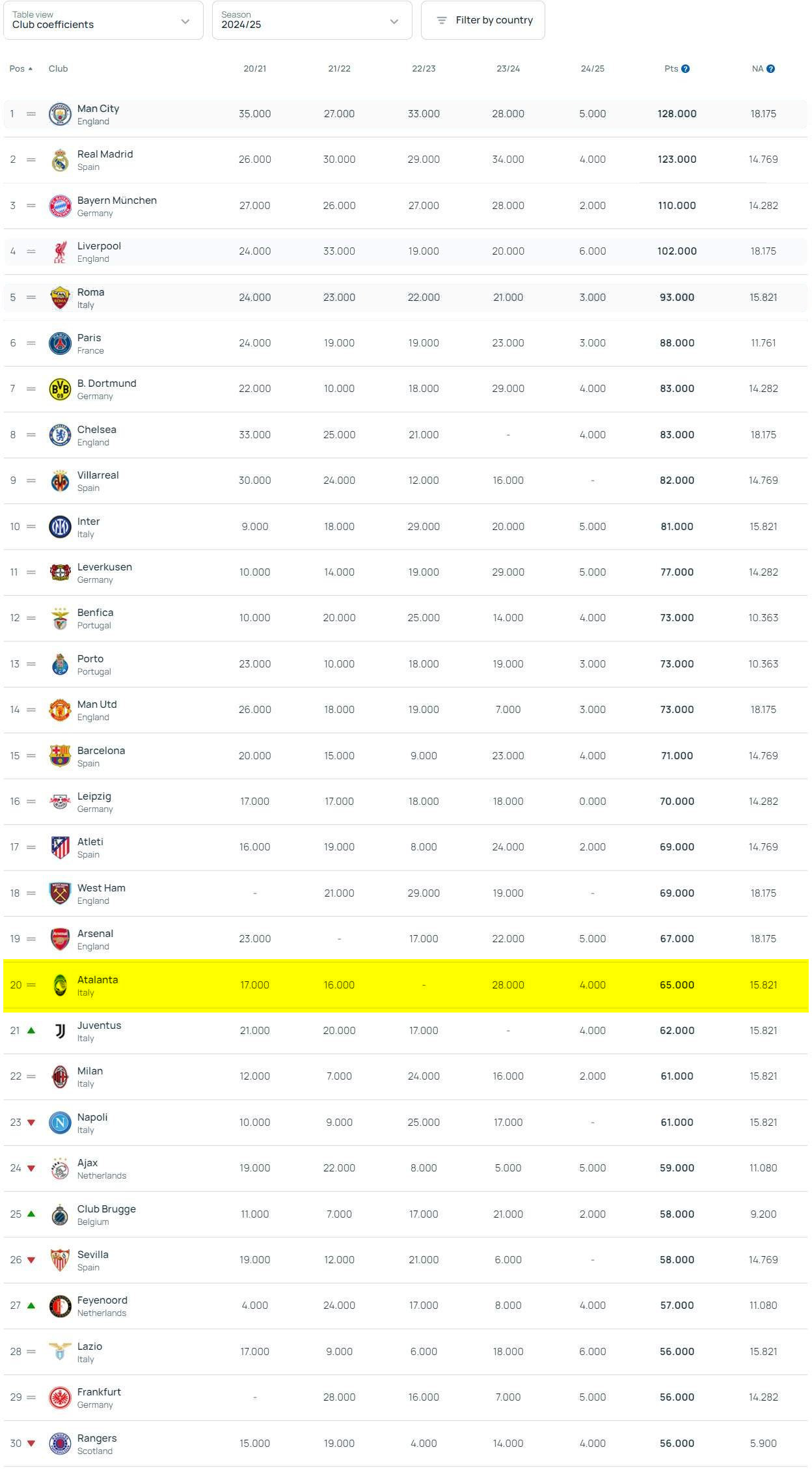 Dopo il mercoledi' di coppa siamo 20mi nell'UEFA ufficiale e 10mi nell'ELO