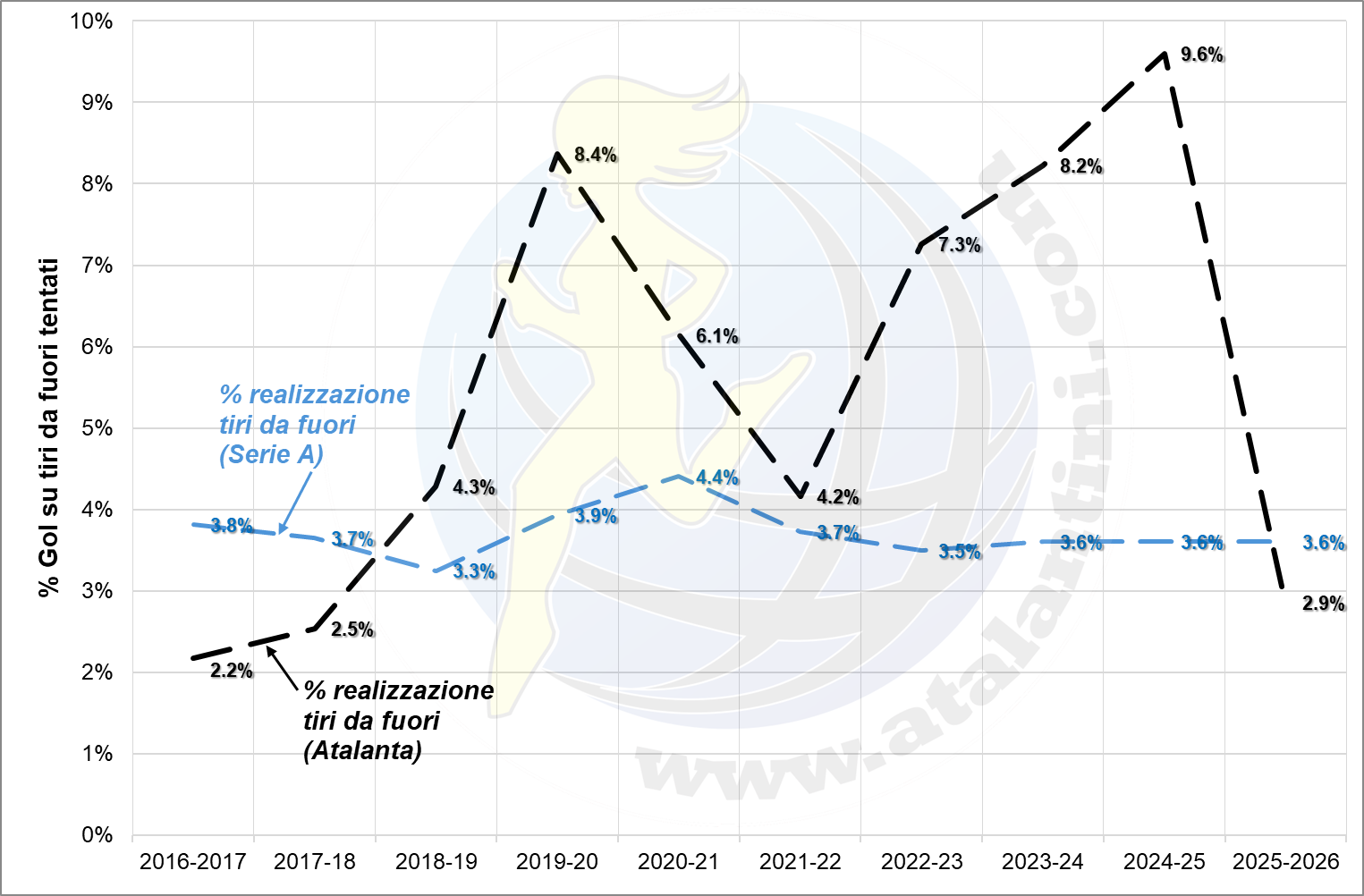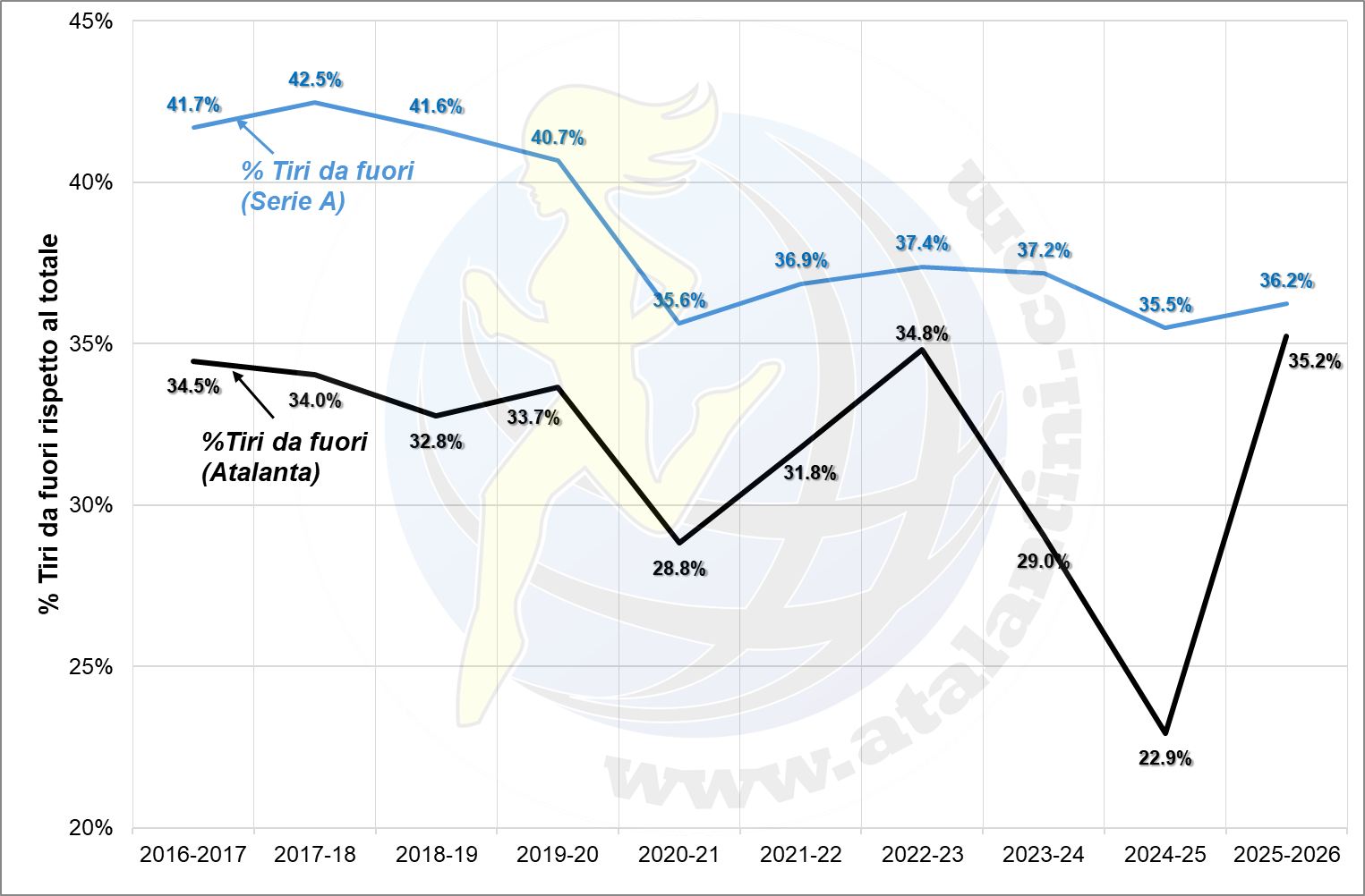 Insomma, l’Atalanta è sempre stata sotto la media della Serie A per la percentuale di tiri da fuori area rispetto a quelli totali negli ultimi 10 anni. Ossia, rispetto alle altre squadre privilegiava molto di più i tiri negli ultimi 16 metri. Per cui, quella sensazione di “avversione” al tiro da fuori da parte dei nerazzurri sembra essere confermata dai dati.