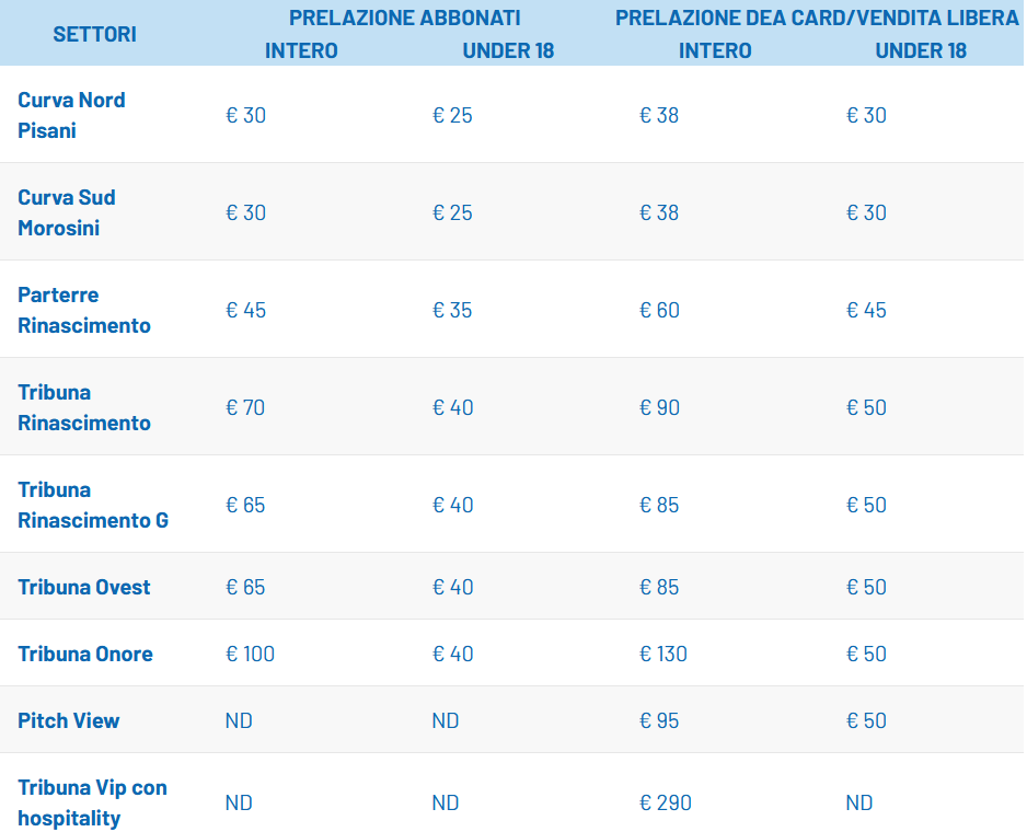 Di seguito i settori dello stadio di Bergamo ed i relativi prezzi, ai quali vanno sommate le commissioni di servizio Vivaticket.