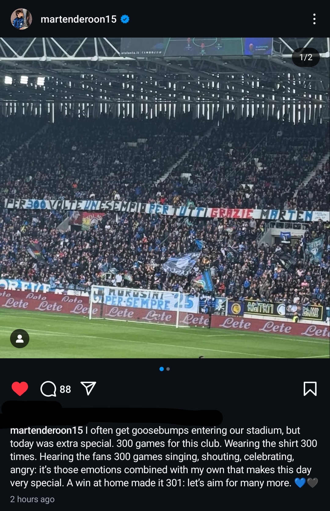 Marten de Roon ha festeggiato al meglio le 300 partite in serie A con l'Atalanta e lo ricorda con questo bel messaggio su Instagram.