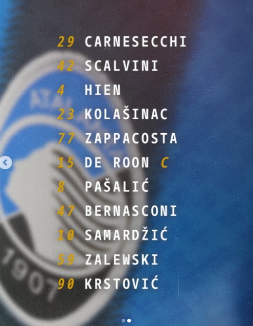 ATALANTA (3-4-2-1): Carnesecchi; Scalvini, Hien, Kolasinac; Zappacosta, Zalewski, De Roon, Bernasconi; Samardzic, Pasalic; Krstovic. All. Palladino