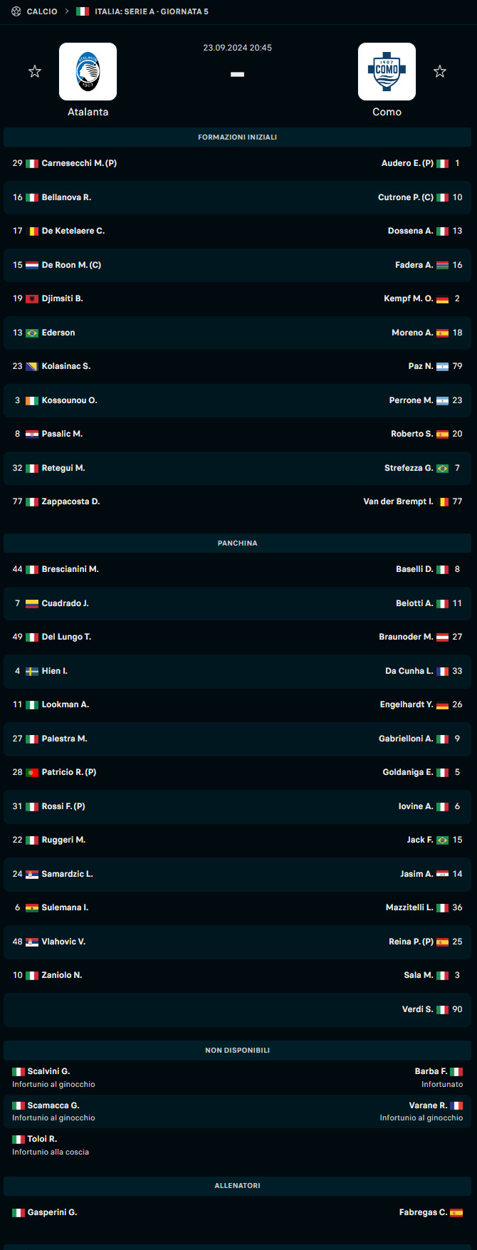 LE FORMAZIONI UFFICIALI DI ATALANTA - COMO. Esordio di Kossounou