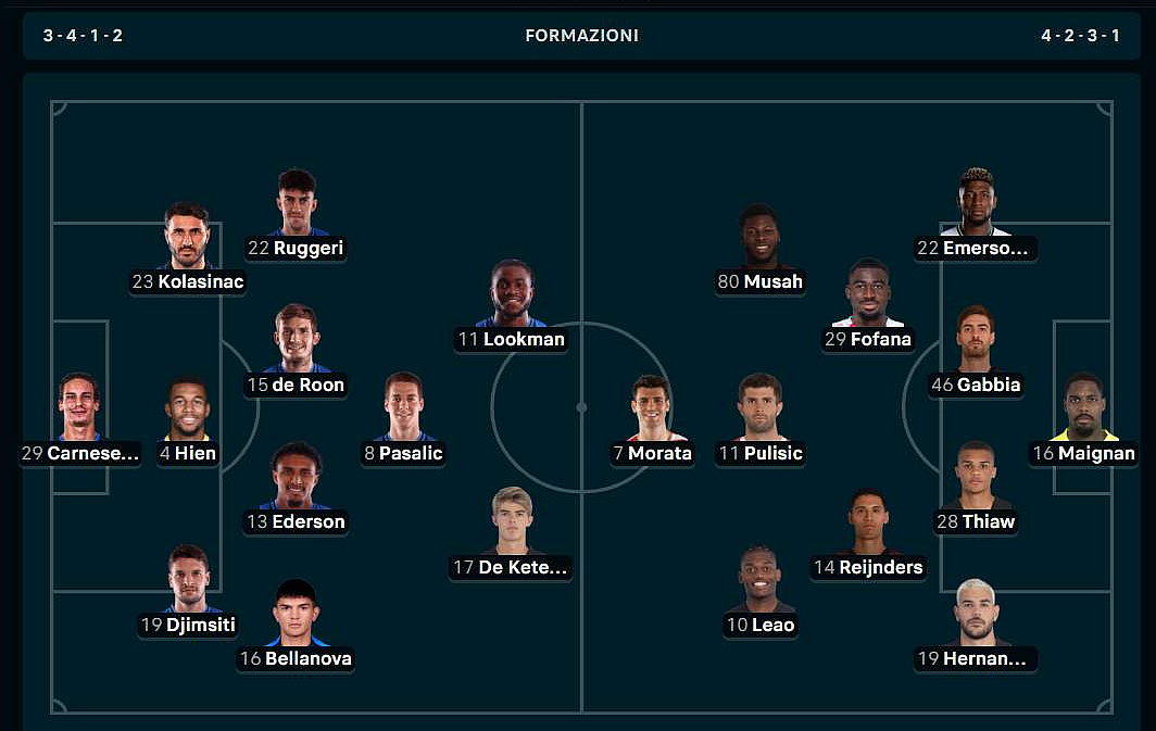 A disposizione: Sportiello, Torriani, Calabria, Loftus-Cheek, Okafor, Chukwueze, Tomori, Pavlovic, Terracciano, Camarda. Abraham.