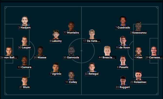 ATALANTA (3-4-2-1): Carnesecchi; Kossounou; Hien, Kolasinac; Cuadrado, de Roon, Pasalic, Ruggeri; Brescianini; De Ketelaere, Retegui