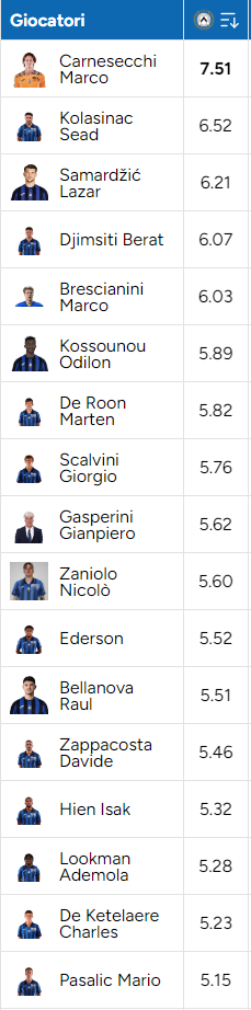 Tutt'altro che una sorpresa l'intitolazione al migliore in campo ad Udine dei nostri. Nettissimo il margine di Carnesecchi sul secondo, il gladiatorio Kolasinac. Solamente 5 i sufficienti tra i 17 in campo, mister compreso, cui questa volta evidentemente e' attribuito qualche errore...